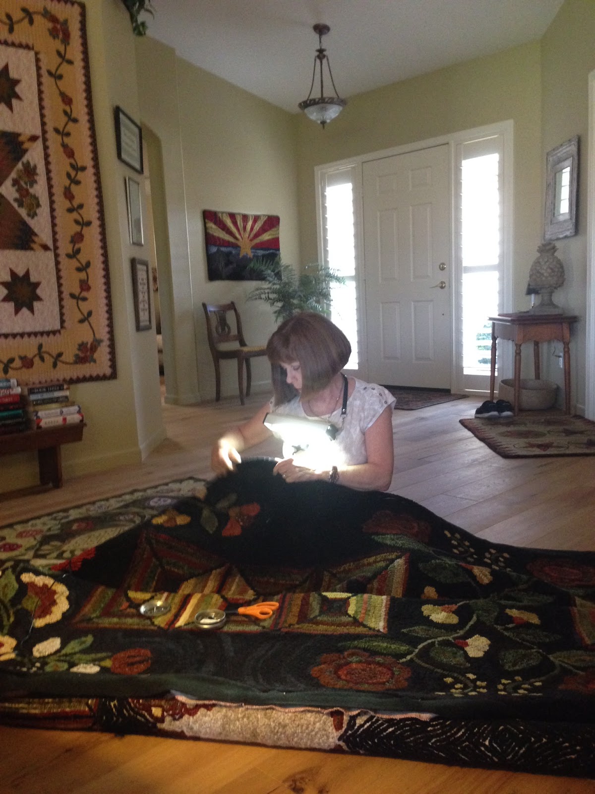 I'm back in Oregon but my hooking project stayed down in AZ. It will be there when I get back in the Fall. My friend Sally finished "Antique Floral Geometric". It looks great in her house.